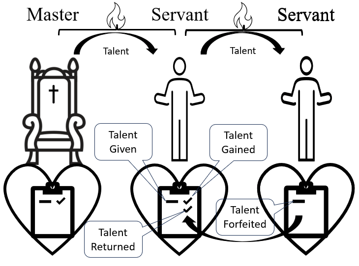 The master entrusted the first servant with five talents, the second with two, and the third with a single talent. The diagram on the right shows everyone’s status when the lord left.
