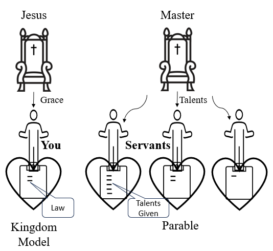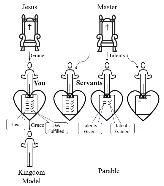 An abbreviated diagram of the kingdom model is on the left. There is only one thing you receive from Jesus: grace, divine love. That diagram shows that you received two units of grace. The model on the right is a diagram of the parable. Talents in the parable correspond to grace in the kingdom model. The number of talents given were written in their account as they were given. As we will see shortly, the account is referred to in the parable.