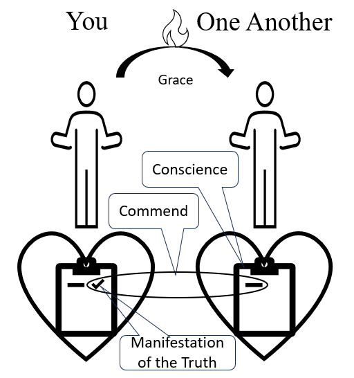 We commend ourselves to a man’s conscience with the transaction of love, writing the details of grace on both our accounts, with our name on his account, and his name on our account. Conscience is another word for the account. It may be more or less, but there is not enough to go on at this time to determine whether the two are equivalent.