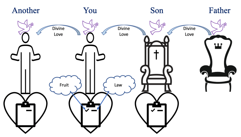 Fruit is the fulfillment of the righteousness of the law in you. When there is no law, there can be no fulfillment. As Jesus could not love us with love he had not received from the Father, we cannot love one another with love that we have not received from him.