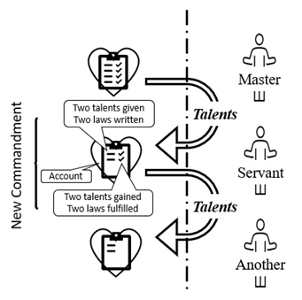From the language of the parable, it is not clear how a servant would go about gaining a talent. However, when we map details from the parable into the model, it becomes clear how a talent is gained. In the model, there is only one thing given to the servant: divine love. When divine love is given, with it comes the expectation that the love was to be continued by loving one another. A talent is gained by obeying Christ’s New Commandment, to love one another as I have loved you.