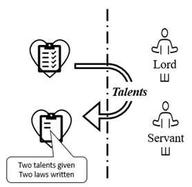 The cast of characters in this parable is the lord and three servants. As the story goes, the lord gave five talents to the first servant, two talents to the second, and one to the third. For simplicity sake, I will map only the two-talent servant into the model.