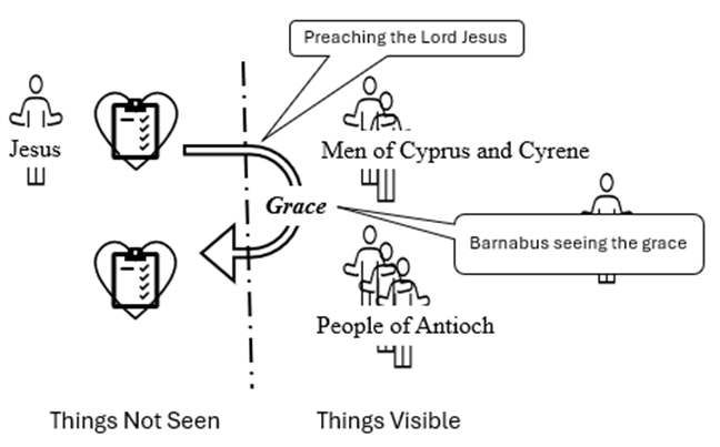 Barnabus saw the grace of God working in the people in Antioch. Grace becomes visible when it travels from one heart to others. What Barnabus saw was the great number who believed and turned to the Lord, and that was evidence that God was at work in them.