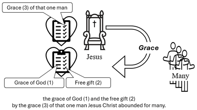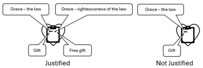 The grace of God (1) is the law written on the heart of the believer, and the free gift (2) is the fulfillment of the law. Righteousness is essentially the same Greek word as justification. Without righteousness, the fulfillment of the law of the Spirit, no one is justified.