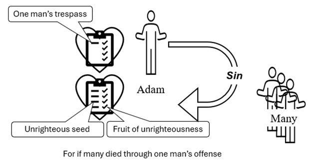 This figure illustrates how many died as the result of one man’s offense in verse 15. Adam ate the fruit of the tree of the knowledge of good and evil and was separated from God, spiritual death. The seed from the fruit of that tree propagated just like grace propagates through the kingdom of God.