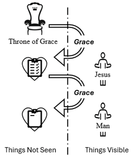 This is a good time to explain the will of God. When you are loved by Jesus, often through another, a law is written upon your heart. That law is fulfilled when you work together with the Spirit, giving as you have received. The law written upon your heart is the will of God for you. His will is in the sight of God, in the realm of things not seen. His will for you is only visible to you when you receive his grace, as it travels through the corridor where it can be seen. Once it arrives, it is buried in the heart, in the realm of things not seen.