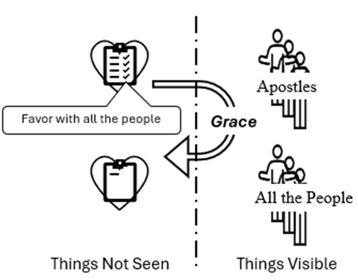 We saw how Jesus grew in favor with man. Now the apostles are seen having favor with the people, as the salvation of the people was visible, as grace traveled through the corridors of things visible.