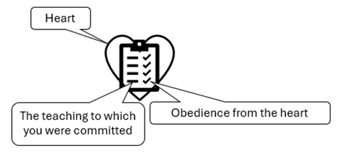 Obedience from the heart is intrinsic to the New Commandment. The teaching to which you were committed is the predicate of the New Commandment – as I have loved you. Obedience from the heart is obedience to the New Commandment – love one another.